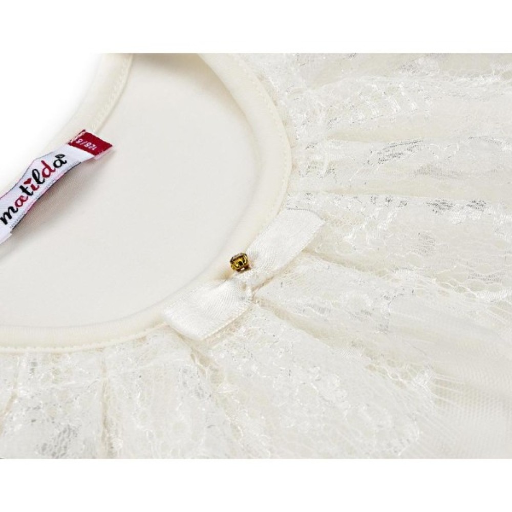 Чудова модна модель напівприлягаючого силуету з довгим рукавом, приємного кремового кольору, виконана з м'якого, якісного, турецького бавовняного трикотажу, з додаванням невеликого % еластану для підтримки форми. Верхня частина переду прикрашена двома оборками з ніжного перламутрового гіпюру і м'якого фатину. Додатковою прикрасою служить невеликий атласний бантик зі сріблястим кристалом. Овальна горловина окантована еластичною трикотажною бейкою.