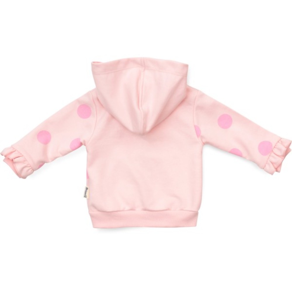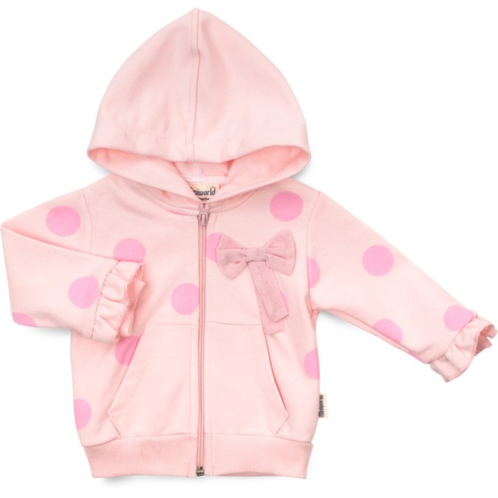 - Дуже зручна трикотажна модель на блискавці з капюшоном, прикрашена трикотажними рюшиками на рукавах та симпатичним, пришитим шифоновим бантиком