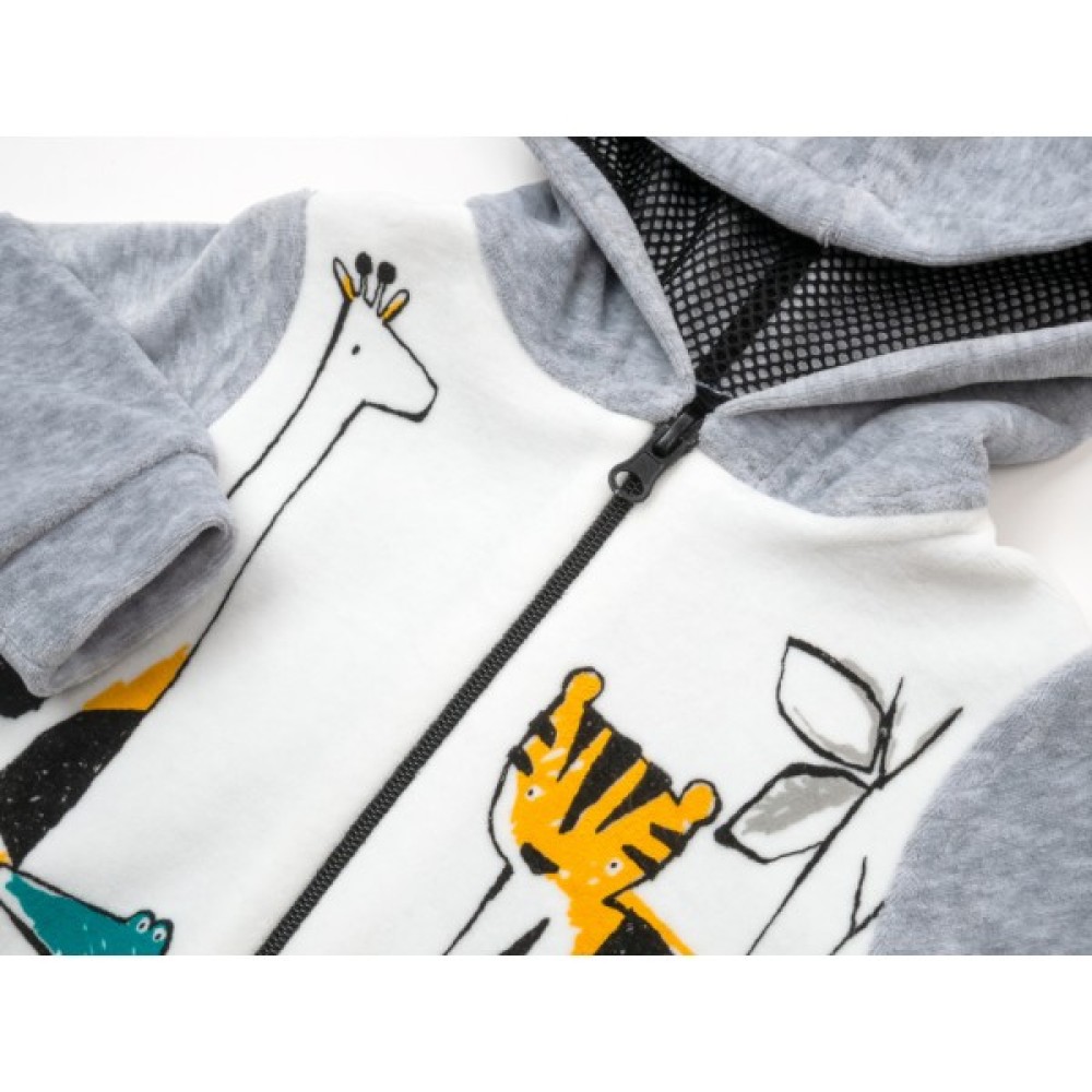 • Дуже зручна трикотажна модель на блискавці з капюшоном для хлопчика, прикрашена симпатичними малюнками звірят