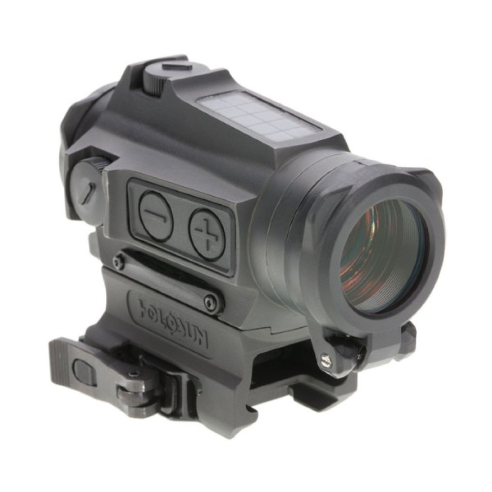 Holosun HE515CT-GR - високотехнологічний і надміцний приціл коліматора в титановому корпусі з оптикою діаметром 20 мм і повним багатошаровим просвітленням всіх поверхонь. Модель відрізняється гібридною системою живлення на основі сонячних панелей Solar Failsafe™, а також змінними прицільними сітками: точка (2 МОА) або точка 2 МОА у колі 65 МОА. Фірмовий світлодіод зеленого кольору Holosun's Super LED з 12 рівнями яскравості дуже комфортний для зору, гарантуючи при цьому максимальну зручність при наведенні на ціль. Підсвічування може регулюватися вручну або автоматично, ідеально підлаштовуючись під зовнішнє освітлення. Технологія Shake Awake™ забезпечує до 50000 годин роботи від одного заряду батареї, активуючи підсвічування під час вібрації та вимикаючи її при тривалому стані спокою.