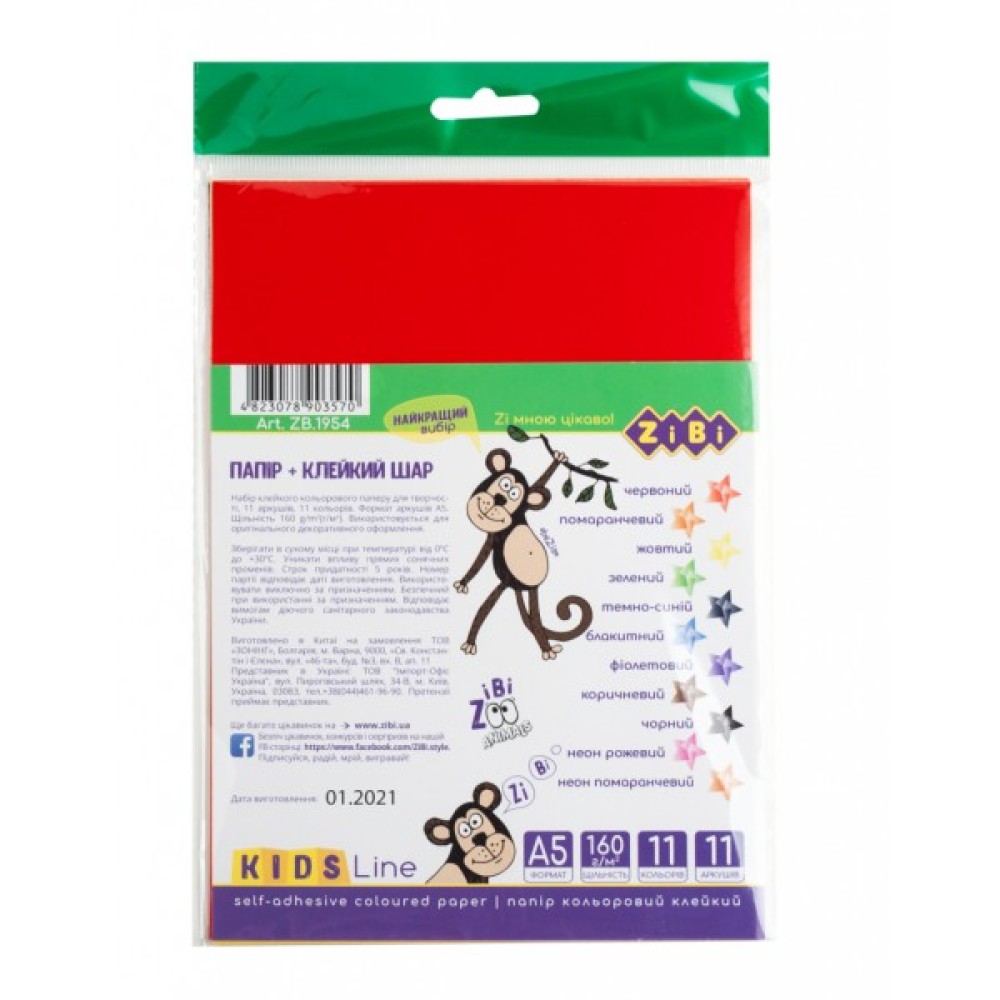Набір самоклеючого паперу — це яскравий інструмент для втілення будь-яких творчих фантазій. Самоклеючий папір — альтернатива звичайному кольоровому паперу. При роботі з ним клей не потрібен, тому робоче місце залишиться чистим. Папір легко ріжеться ножицями, після вирізання досить зняти захисний шар і можна закріпити на будь-якій поверхні. Ідеальний варіант для аплікацій. У наборі 11 аркушів: 9 стандартних кольорів, 2 неонових кольори, формат А5. Щільність паперу 180/160 г/м2. Паперова підкладка з просічкою. 2 види дизайну в упаковці.