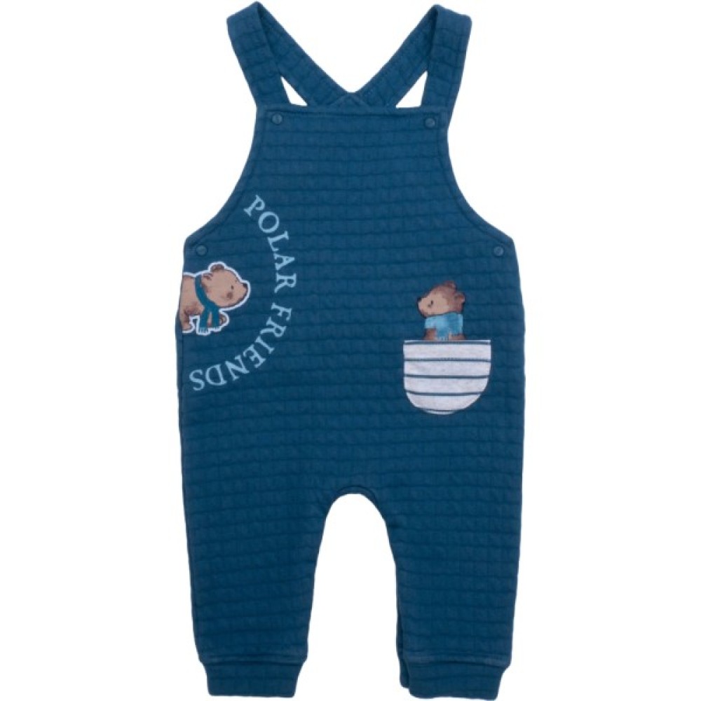 • Зручний високий напівкомбінезон на шлеях та манжетах, виготовлений з м'якого, подвійного та дуже приємного на дотик бавовняного трикотажу (78%бавовна, 22% поліестер), простьобаного між собою невеличкими квадратиками, без середнього шва (шва сидіння). Нерегульовані бретелі та бічні частини ( у швах з обох боків) застібаються на маленькі металеві фірмові кнопочки. Для зручності при зміні підгузка, між ніжками, штанці застібаються на приховані кнопки. Штанці прикрашені симпатичними кольоровими принтовими малюночками та невеличкою накладною кишенькою.