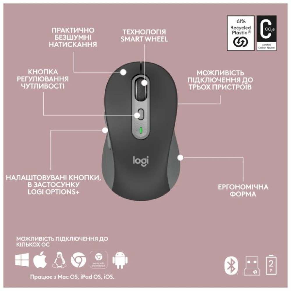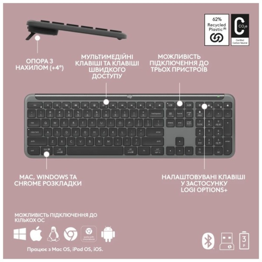 Logitech MK950 — це надійне та ергономічне рішення для повсякденного використання. Клавіатура має зручне повнорозмірне розташування клавіш, включно з цифровою клавіатурою, що робить її зручною для роботи та ігор. Миша в комплекті обладнана високоточним оптичним датчиком, що забезпечує плавний і точний рух курсора.