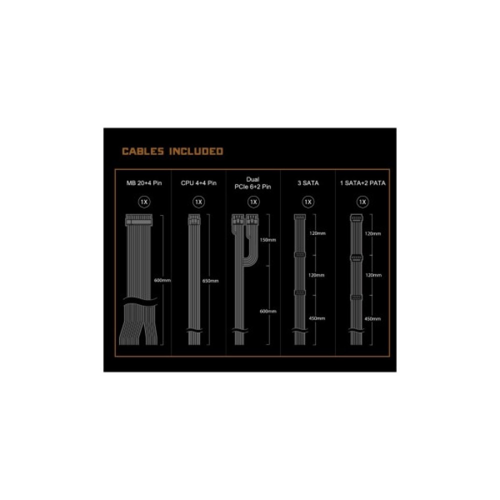 Підключення материнської плати здійснюється через стандартний 24-pin роз'єм, в той час як живлення процесора забезпечується через 4+4 pin роз'єм. За рахунок двох 6+2 pin роз'ємів можливо живлення високопродуктивних відеокарт, що робить блок живлення відповідним для геймерських та мультимедійних систем. Додатково, він оснащений великою кількістю роз'ємів SATA (цілих 8) та 4 роз'ємами Peripheral, що дозволяє підключати безліч накопичувачів і додаткових пристроїв.