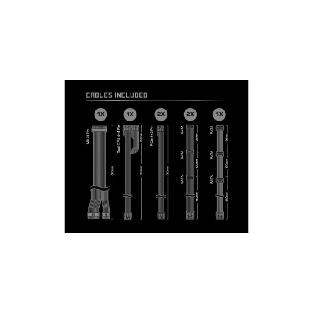 Цей блок живлення оснащений найновішим роз'ємом PCIe 12V-2x6, що дозволяє без проблем підключати найсучасніші та найвимогливіші відеокарти для бездоганної графіки та швидкої обробки даних. Для підключення процесора передбачено 2x4+4 pin, що підвищує стабільність і надійність живлення.