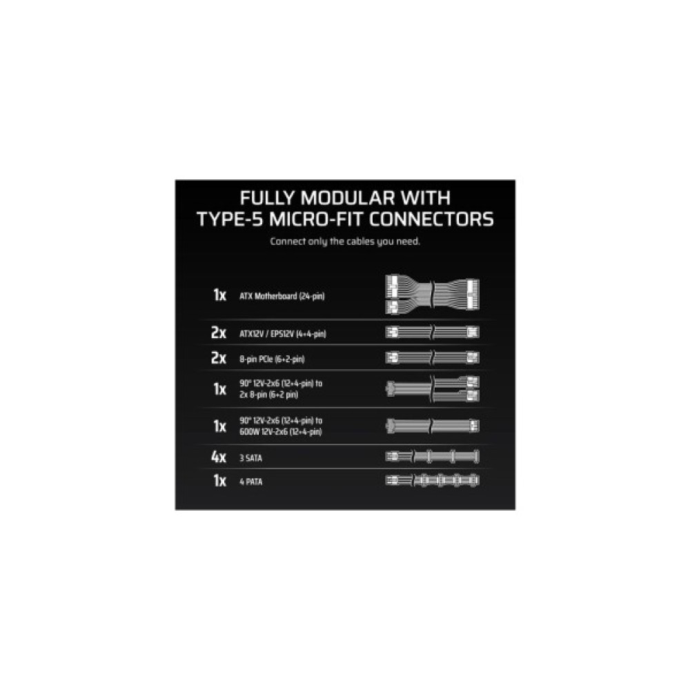 Стабільна вихідна потужність при загальному ККД до 89% та сертифікат Cybenetics Gold, що підтверджує нижче енергоспоживання, тихішу роботу та нижчі температури.