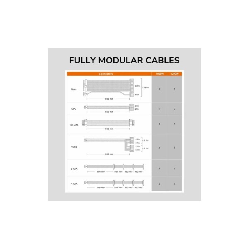 Модульне підключення кабелів забезпечує гнучкість та зручність. Повністю модульний дизайн дозволяє підключати тільки ті кабелі, які дійсно потрібні, що мінімізує безлад та поліпшує потік повітря всередині корпусу комп'ютера. Це, у свою чергу, забезпечує кращі умови охолодження компонентів, продовжуючи їхню довговічність.