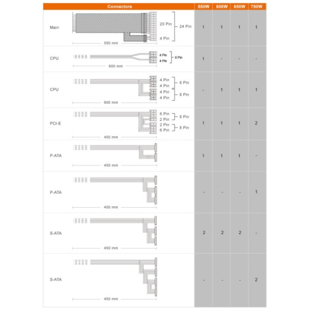 Cougar ATLAS650 забезпечено усіма необхідними з'єднаннями для сучасних систем. В його оснащенні є 2 роз'єми для підключення центрального процесора (2x4+4pin) та 2 роз'єми для відеокарт (2x6+2pin), що робить його ідеальним для потужних геймерських або робочих станцій. Також передбачено 6 роз'ємів SATA та 2 Peripheral роз'єми для підключення різноманітних накопичувачів та периферійних пристроїв.