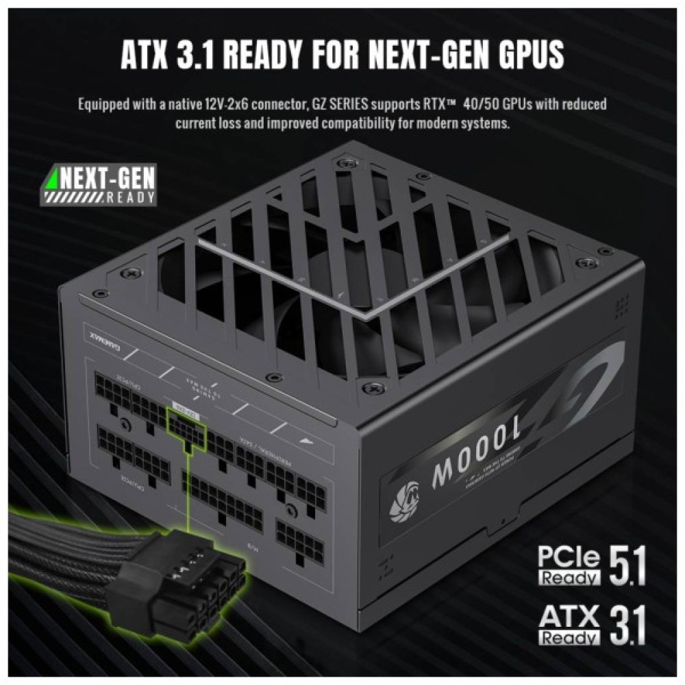 GAMEMAX GZ 1000G BK — це потужний та надійний блок живлення для сучасних ігрових і робочих ПК, розрахований на високі навантаження та новітні комплектуючі. Підтримка стандартів ATX3.1 і PCIe 5.1 з нативним роз’ємом 12V-2x6 забезпечує стабільне та безпечне підключення відеокарт RTX™ 40/50 серій, мінімізуючи втрати струму та підвищуючи загальну ефективність системи.