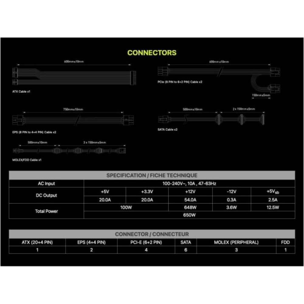 МСІ 650W (MAG A650GL) підтримує підключення до материнської плати через 20+4 pin роз'єм, до процесора через 2x4+4pin роз'єми, а також надає чотири роз'єми 6+2 pin для додаткового живлення відеокарт, що ідеально підходить для сучасних потужних графічних адаптерів. Підключення до периферійних пристроїв забезпечується через чотири роз'єми Peripheral і шість роз'ємів SATA, плюс один FDD роз'єм для більш антикварної периферії.
