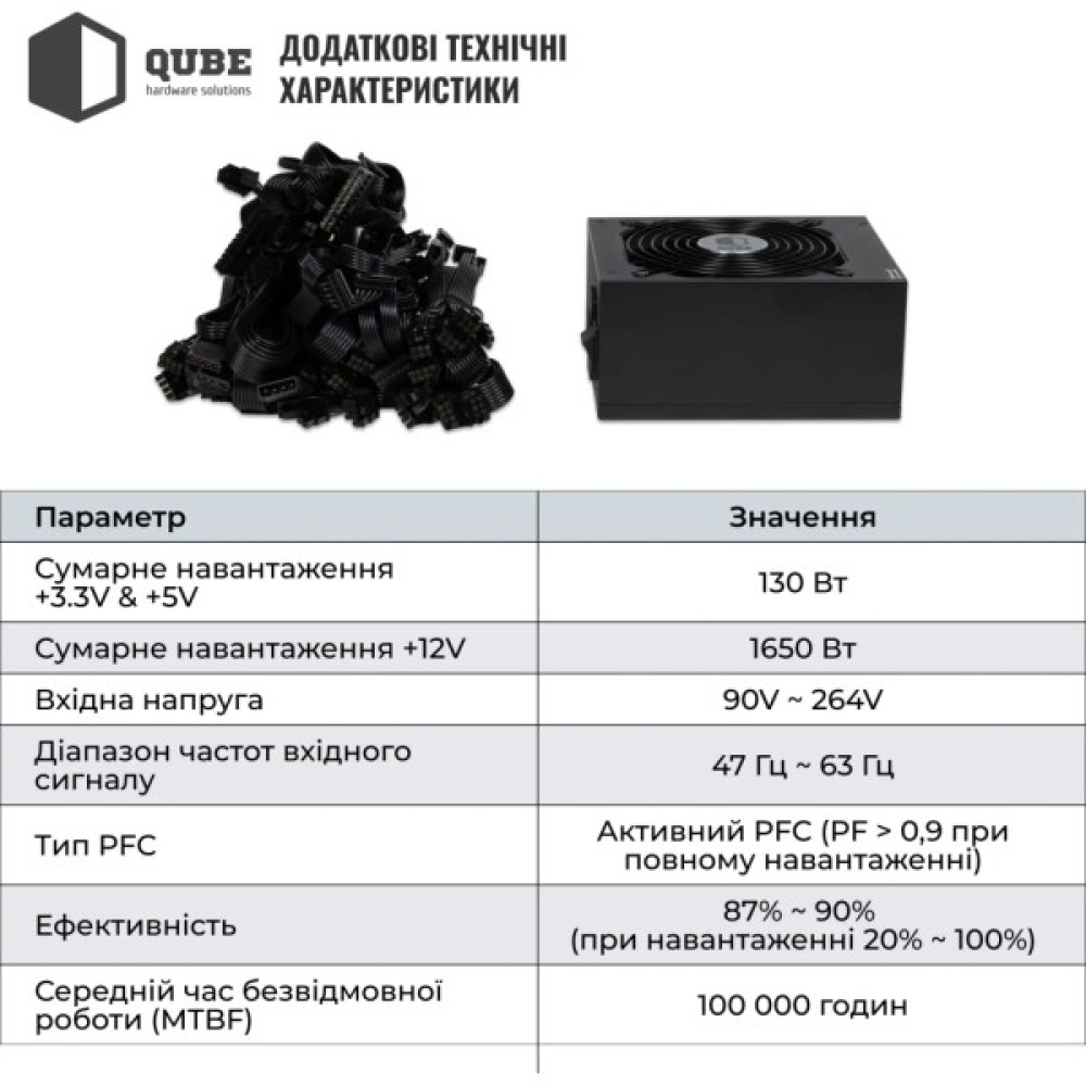 Блок живлення Qube 1650W (QBF-HP1-1650GD-14C) - це першокласне рішення для користувачів, які цінують якість, надійність та продуктивність своєї комп'ютерної системи. З потужністю в 1650 Вт, цей блок живлення забезпечує стабільну роботу навіть для найбільш вимогливих конфігурацій, включаючи сучасні багатоядерні процесори та високопродуктивні відеокарти. Його стандарт ATX розрахований на універсальну сумісність з більшістю корпусів, що значно спрощує процес інтеграції в існуючу систему.