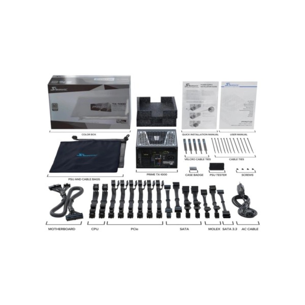 PRIME TX-1000 підтримує новітні стандарти підключення з широким асортиментом роз'ємів, що включають 24+8 pin для материнської плати, 2x4+4pin для процесора, шість 6+2 pin для відеокарт, 14 роз'ємів SATA, 5 Peripheral і один FDD. Це робить блок живлення універсальним рішенням для складання чи модернізації системи з різноманітними конфігураціями.
