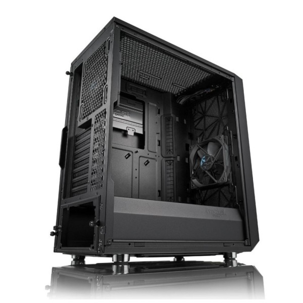 Корпус оснащений два встановленими вентиляторами Fractal Design Dynamic X2 GP-12 120 мм, які створюють ефективний потік повітря, забезпечуючи охолодження з мінімальним рівнем шуму. Завдяки цьому ви можете бути впевнені, що всі ключові компоненти, такі як процесор та відеокарта (максимальною довжиною до 315 мм), залишатимуться надійно охолодженими навіть під час інтенсивних ігор або виконання складних завдань.