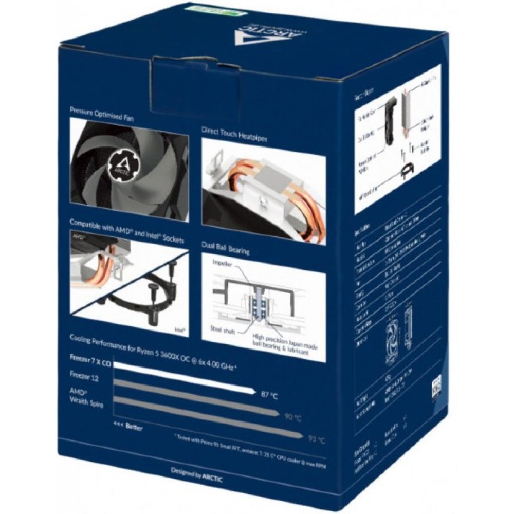 Arctic Freezer 7 X CO — це компактний процесорний кулер з одним 92-мм вентилятором. Він сумісний із загальними роз'ємами Intel і AMD. Завдяки подвійному кульковому підшипнику він оптимізований для безперервної роботи. Freezer 7 X CO має поліпшену конструкцію радіатора та перероблену конструкцію теплових трубок. У поєднанні з вентилятором, який оптимізований для високого статичного тиску, Arctic вдалося суттєво поліпшити ефективність охолодження Freezer 7 X CO.