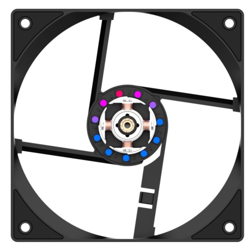 Кулер оснащений вентилятором AS-120-RGB V2, який працює з максимальним рівнем шуму 27.2 дБ(A). На корпусі вентилятора є позначки, що вказують напрямок обертання лопатей та напрямок потоку повітря.