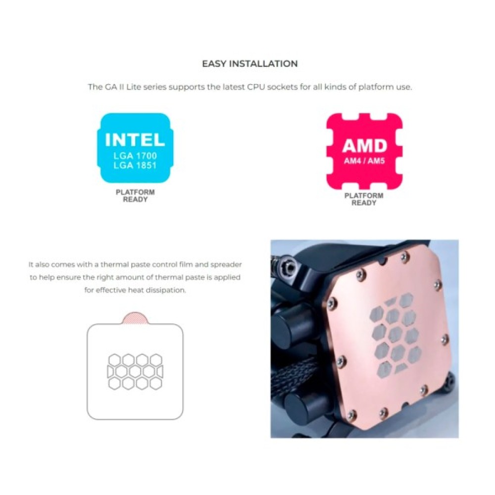 Алюмінієвий радіатор високої щільності товщиною 27 мм максимізує площу поверхні для ефективного розсіювання тепла. Міцна плетена трубка довжиною 400 мм забезпечує виняткову гнучкість, довговічність і герметичність, що гарантує легкість встановлення та преміальну естетику. Радіатор також постачається з плівкою для контролю термопасти та розподільником, які допомагають забезпечити нанесення потрібної кількості термопасти для ефективного розсіювання тепла.