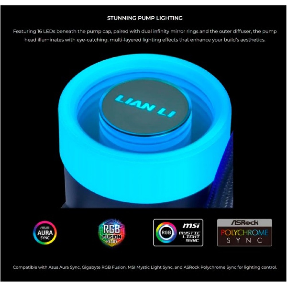 Компактний насос GA II Lite розвиває швидкість до 3800 об/хв, забезпечуючи потужне охолодження для ефективного керування температурою процесора. Завдяки 16 світлодіодним індикаторам під кришкою насоса в поєднанні з подвійними дзеркальними кільцями, насос підсвічується привабливими багатошаровими світловими ефектами, які покращують естетику вашої конструкції.