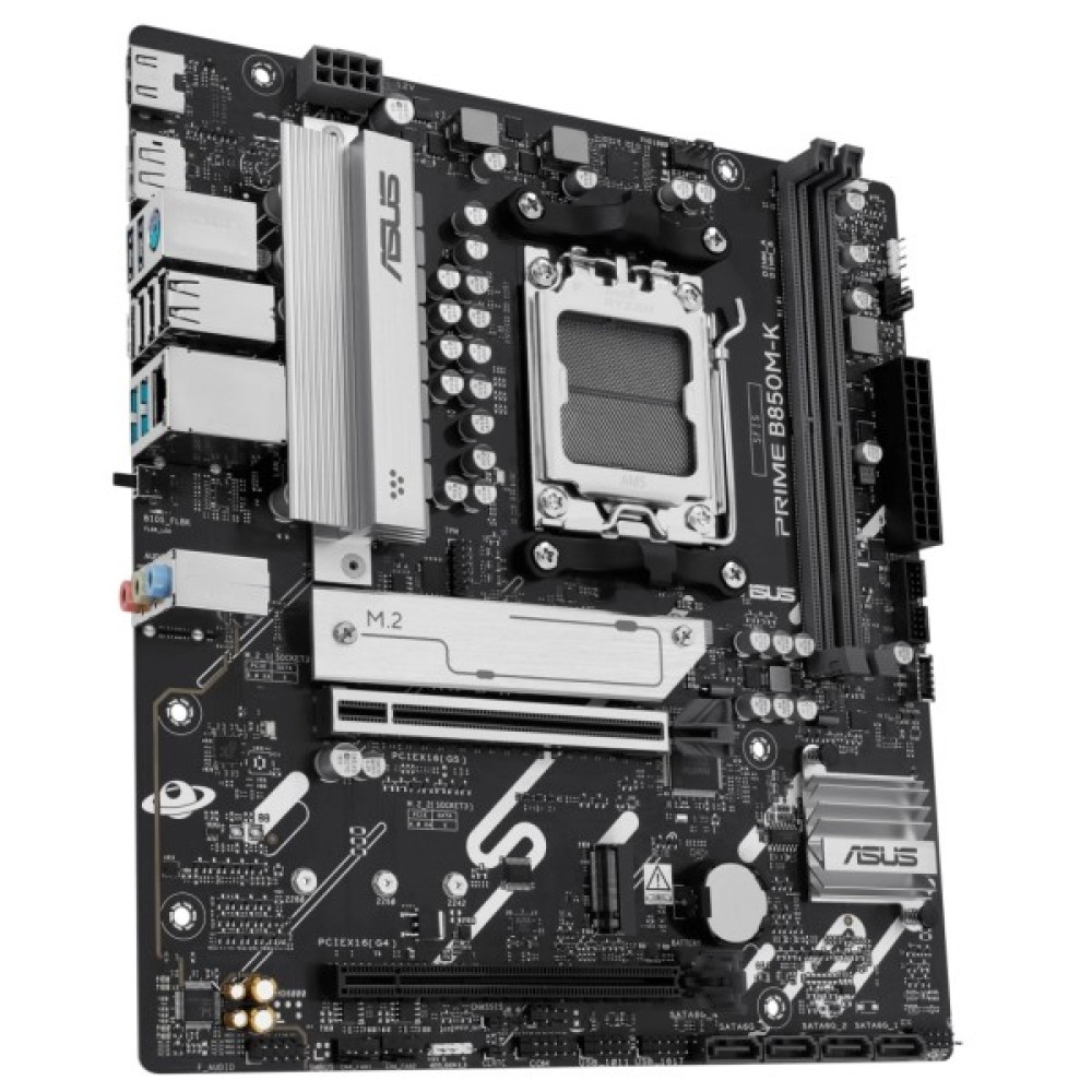 ASUS PRIME B850M-K підтримує сучасний інтерфейс PCIe 5.0, що дозволяє максимально використовувати переваги високошвидкісного оброблення даних. Чотири порти USB 2.0, два USB 5Gbps (Type-A) та два USB 10Gbps (Type-A) дають змогу миттєво підключати периферійні пристрої. Розширені можливості підключення доповнюються двома слотами M.2, що гарантують швидке завантаження і активність SSD-дисків.