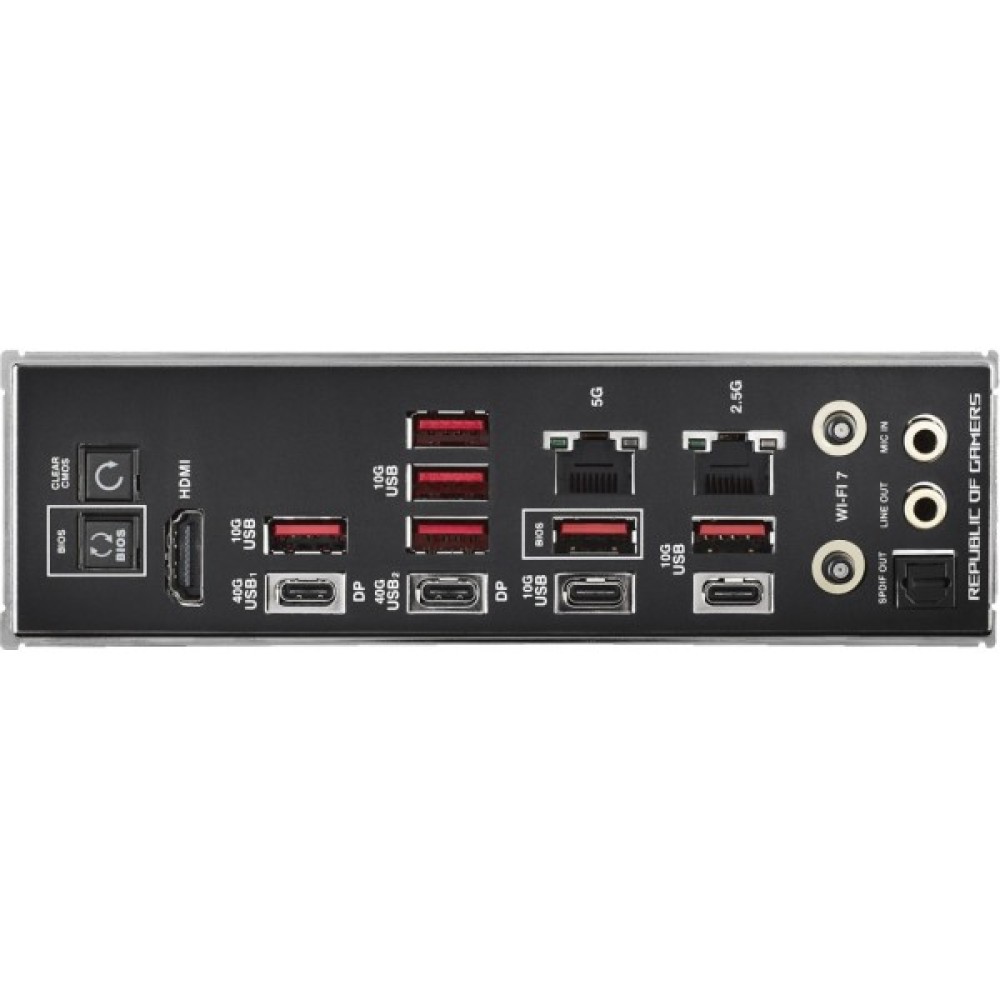 Зовнішні порти 1 x Clear CMOS button; 2 x USB 3.2 Gen2 Type-C; 1 x Wi-Fi Module; 6 x USB 3.2 Gen 2 Type-A; 2 x USB4 (40Gbps) ports (2 x USB Type-C); 2 x RJ45; 1 x HDMI; 1 x optical SPDIF out; 2 x Audio