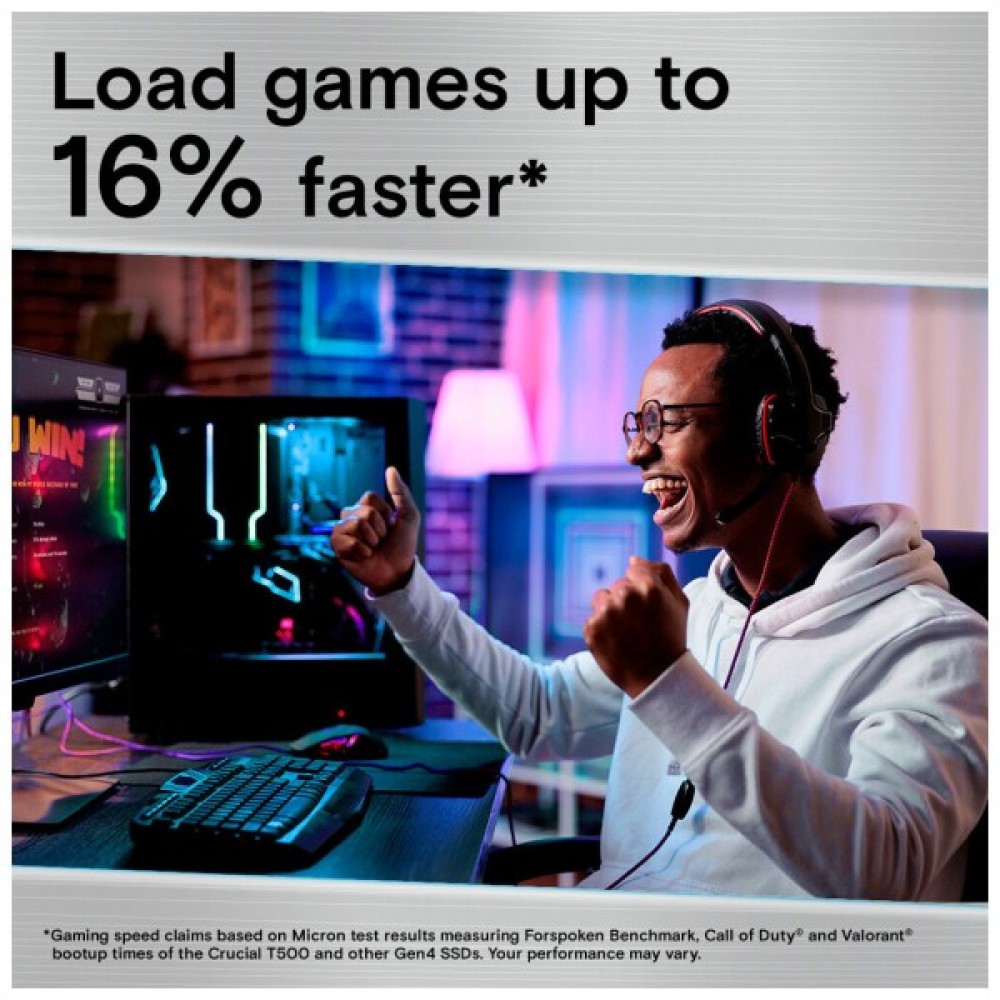 Прискорення завантаження, завантаження та збереження за допомогою послідовного читання/запису 7400/7000 МБ/с — Crucial T500 PCle 4.0 NVMe SSD більш ніж у 2 рази швидший, ніж Gen3 SSD, і в 12 разів швидше ніж SATA.