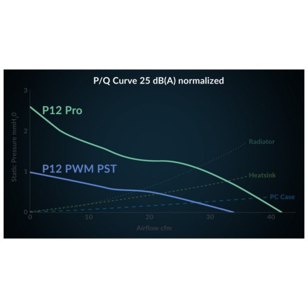Вентилятор забезпечує високу продуктивність на низьких обертах, створюючи більший повітряний потік і статичний тиск при всього лише 25 дБ(A) — ідеально для тихого та потужного охолодження.