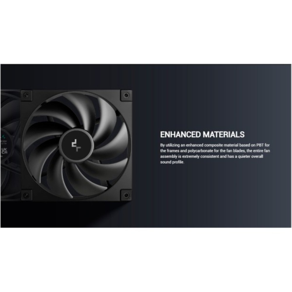 - ПОЛІПШЕНІ МАТЕРІАЛИ. Завдяки використанню поліпшеного композитного матеріалу на основі ПБТ для рам і полікарбонату для лопатей вентилятора, увесь вентилятор у зборі вирізняється високою стабільністю і тихішим загальним звуковим профілем