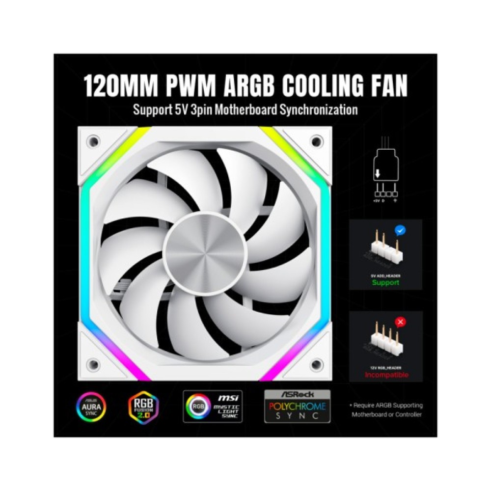 Вентилятор доступний у чорному кольорі з реверсивними лопатями, що додає гнучкості під час монтажу та дозволяє адаптувати його до різних конфігурацій корпусу. GameMax FN12A-N2-R підтримує синхронізацію ARGB-підсвічування з материнськими платами ASUS, MSI та іншими через 5V 3-контактний роз’єм. Це дозволяє створювати динамічні світлові ефекти, які ідеально доповнять зовнішній вигляд вашого ПК.