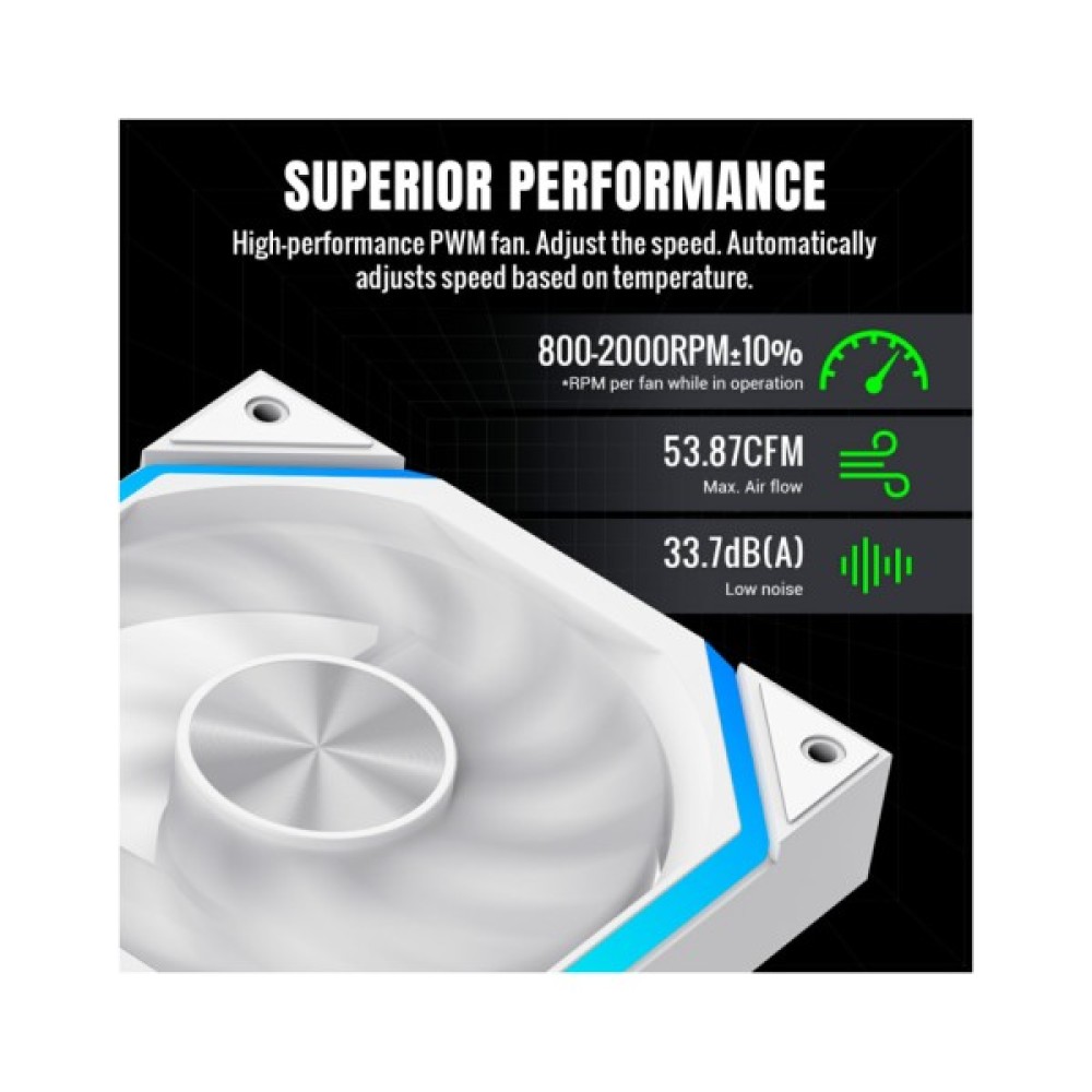 Завдяки 9-лопатевій конструкції вентилятор оптимізує потік повітря, а підтримка PWM-контролю дає змогу автоматично регулювати швидкість обертання в діапазоні 800-2000 об/хв залежно від температури системи, що забезпечує баланс між продуктивністю та енергоефективністю. Однією з ключових особливостей вентилятора є його гідравлічні підшипники, які гарантують тиху роботу навіть під час інтенсивних навантажень. Рівень шуму не перевищує 33,7 дБ, що дозволяє насолоджуватися комфортною тишею під час роботи чи гри.