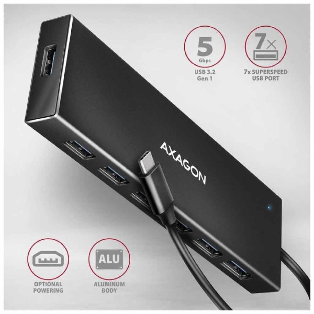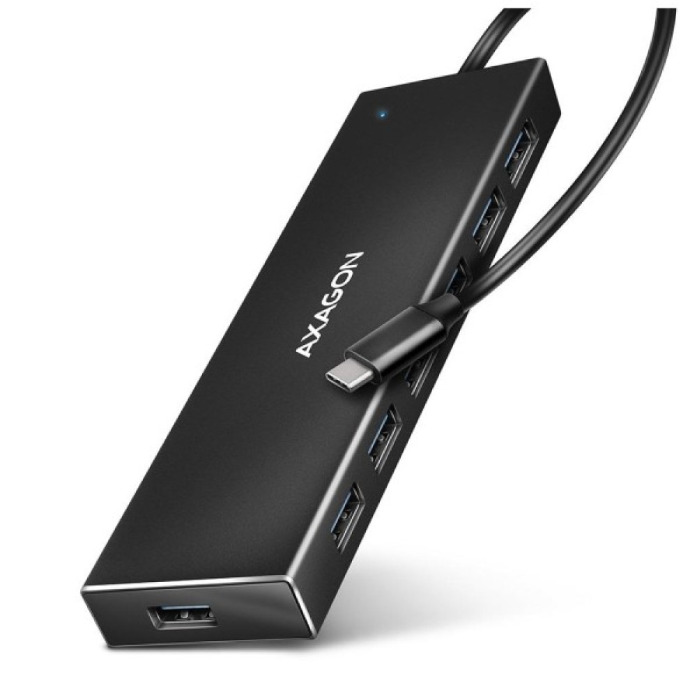 AXAGON HUE-F7C — це високошвидкісний USB-хаб професійного рівня, створений для користувачів, яким потрібно підключити одночасно кілька пристроїв без втрати продуктивності. Він підтримує стандарт USB 3.2 Gen 1, забезпечуючи швидкість передачі даних до 5 Гбіт/с, і пропонує одразу сім портів для роботи з периферією, накопичувачами, телефонами чи планшетами. Цей компактний і витривалий пристрій стане незамінним помічником як у стаціонарному офісі, так і в мобільному сценарії роботи.