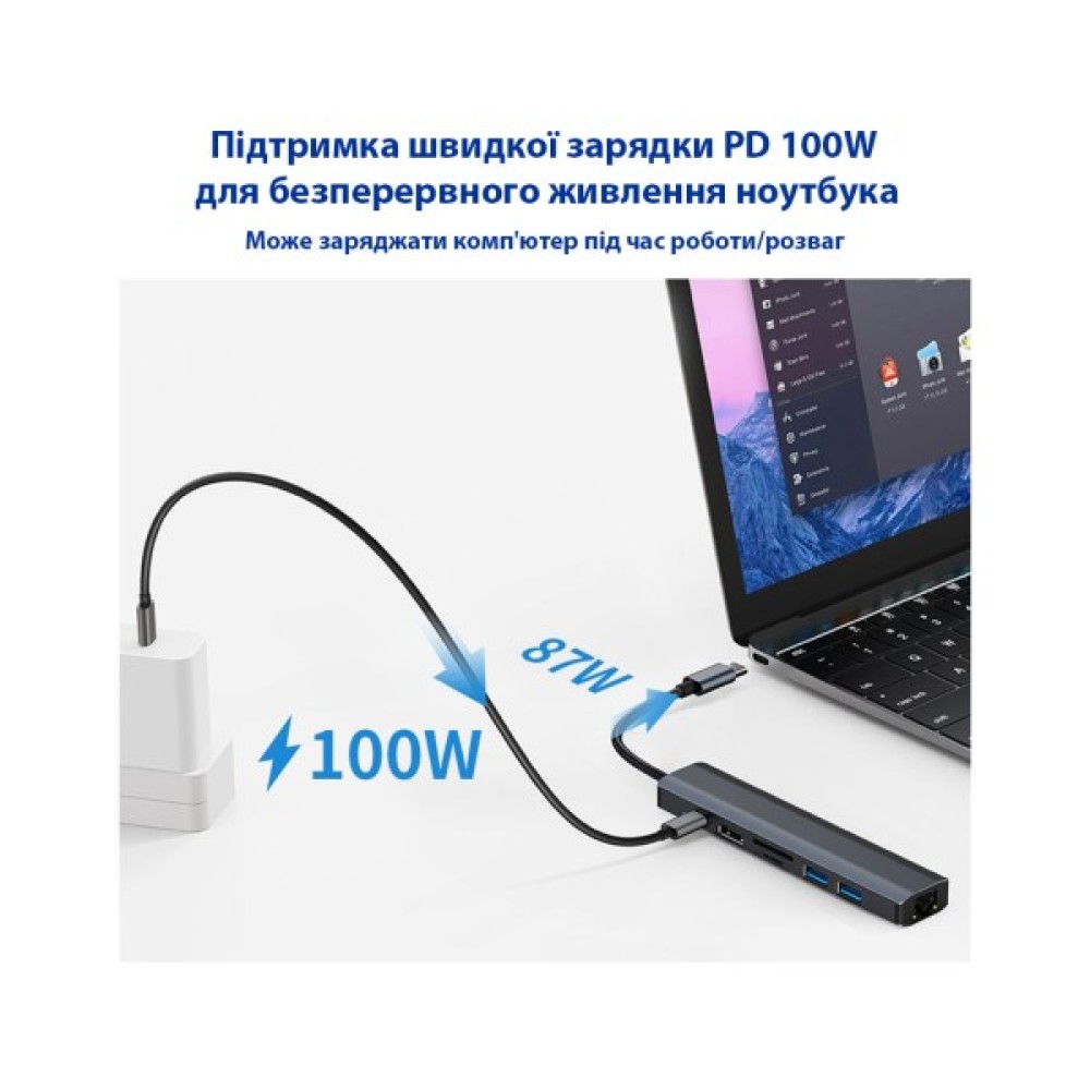 USB-хаб Dynamode BYL-2303є мультипортовим адаптером 7-в-1 і дозволяє підключити Ваш ноутбук, планшет, смартфон з виходом USB Type-C до монітора, телевізора або проектора з інтерфейсом HDMI та виводити на нього зображення з високою роздільною здатністю до 4K Ultra HD (3840x2160) 30Hz або Full HD 1080p 60Hz, що дозволить вам дивитися фільми, ваші відео та фотографії на великому екрані у високій якості. Також ви зможете підключити ваш ноутбук до локальної дротової мережі через конектор RJ-45 Gigabit Ethernet Lan (10/100/1000 Мбіт/с). 2 порти USB 3.0 адаптера використовуються для підключення флеш-накопичувачів, мишки, клавіатури, фотоапарата, камери та інших периферійних пристроїв, а також для підключення USB-кабелю для заряджання та синхронізації мобільних пристроїв. А під'єднавши кабель до порту USB Type-C Female (Power Delivery port), ви зможете швидко зарядити свій ноутбук/смартфон. к. цей порт підтримує специфікацію швидкого заряджання PD 3.0 (20В/3А) - USB Power Delivery 3.0. Однак, цей порт не підтримує передачу даних. Таким чином, у той час, коли ваші периферійні девайси передають інформацію, ваш ноутбук зарядиться.