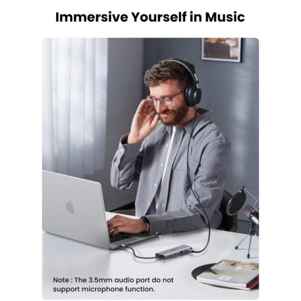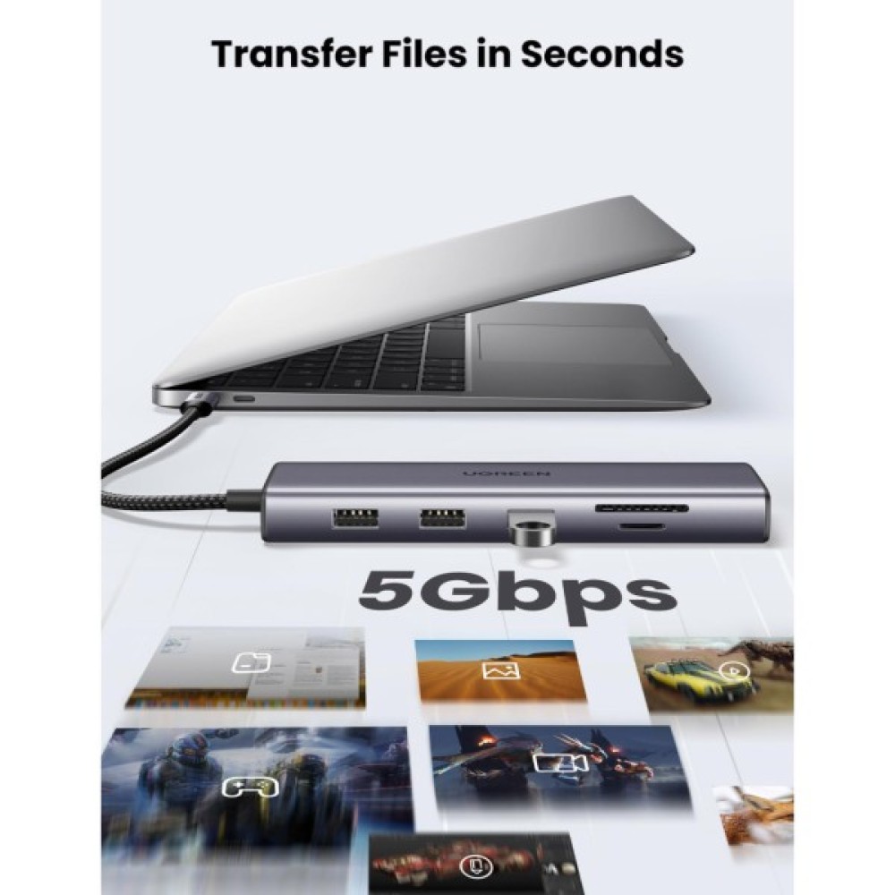 Хаб Ugreen 10 в 1 USB C забезпечує розширений подвійний монітор 4K HDMI і 1080P VGA, порт Gigabit Ethernet, порт зарядки USB C 100 Вт PD, 3 порти USB A 3.0, аудіороз'єм 3.5 мм і пристрій читання карт SD TF. Усі порти багатопортового адаптера можна використовувати одночасно.