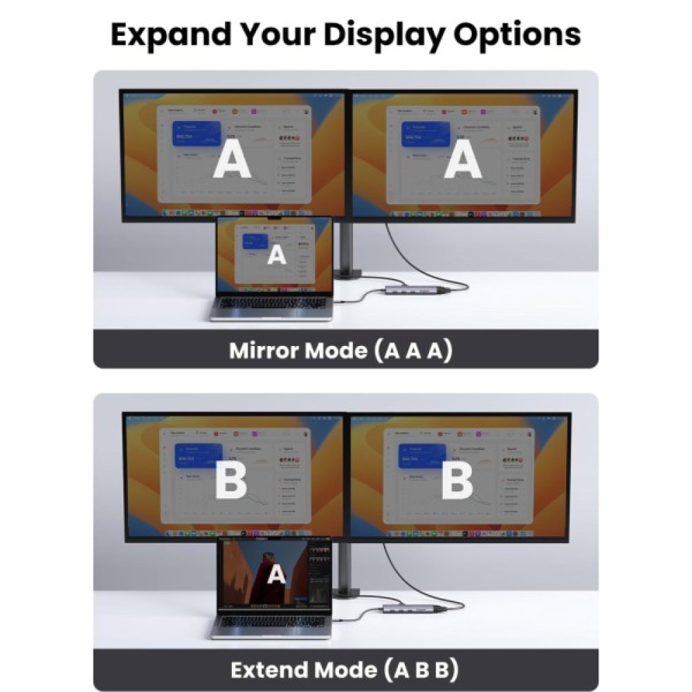 Порти 4K HDMI і 1080P VGA можна одночасно використовувати для різних пристроїв відображення, як-от монітор, телевізор, проєктор. Максимальна вихідна роздільна здатність досягає 4K 30 Гц через HDMI і 1080P 60 Гц через VGA. Дзеркальний режим AAA і розширений режим ABB підтримуються як на Mac, так і на Windows.