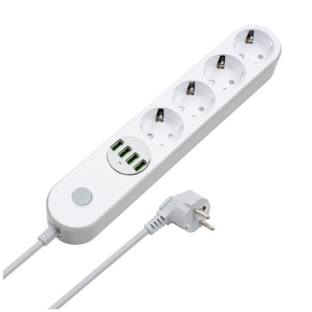 Подовжувач, з чотирма мережевими розетками 220В і 4 USB портами 5В. З його допомогою можна підключати не тільки електроприлади, а й одночасно заряджати до 4 х мобільних пристроїв: смартфони, планшети, зовнішні батареї і багато інших пристроїв, які підтримують зарядку від USB порту.