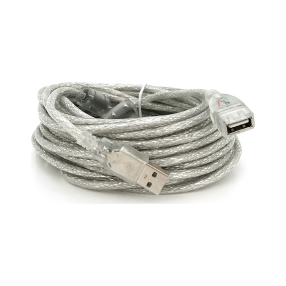 Універсальний USB подовжувач для підключення периферійних пристроїв на відстані до 10 метрів. Оснащений двома феритовими кільцями для придушення перешкод та прозорим білим кабелем із міцною ізоляцією. Підтримує передачу даних та живлення пристроїв за стандартом USB 2.0.