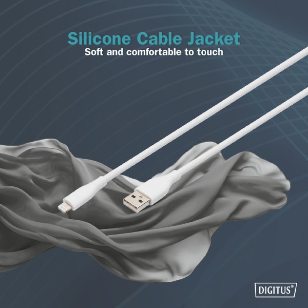 DIGITUS AK-600108-010-W — це 2-метровий кабель USB-A > Lightning із м'яким силіконовим покриттям, що забезпечує швидку та надійну зарядку і синхронізацію пристроїв Apple. Він підтримує стандарт USB 2.0 зі швидкістю передачі даних до 480 Мбіт/с і забезпечує заряджання потужністю до 12 Вт (5 В, 2.4 А). М'який силікон додає гнучкості й запобігає заплутуванню кабелю, а також забезпечує довговічність — кабель витримує до 25 000 циклів згинання. Білий колір та компактний дизайн роблять його стильним і зручним для щоденного використання.