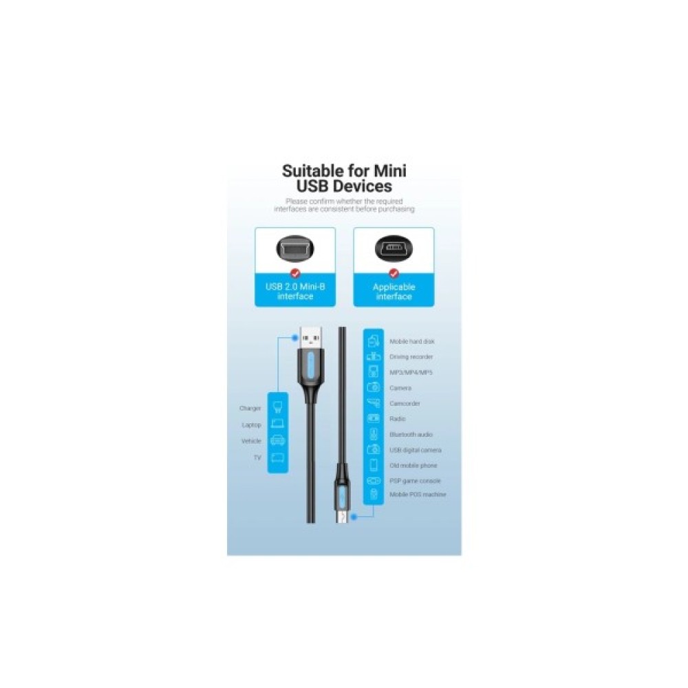 Кабель USB 2.0 на Mini USB Vention (1 м, 2 А, 480 Мбіт/с, для відеореєстраторів, камер та MP3, екранований, захист від згинів, чорний)
