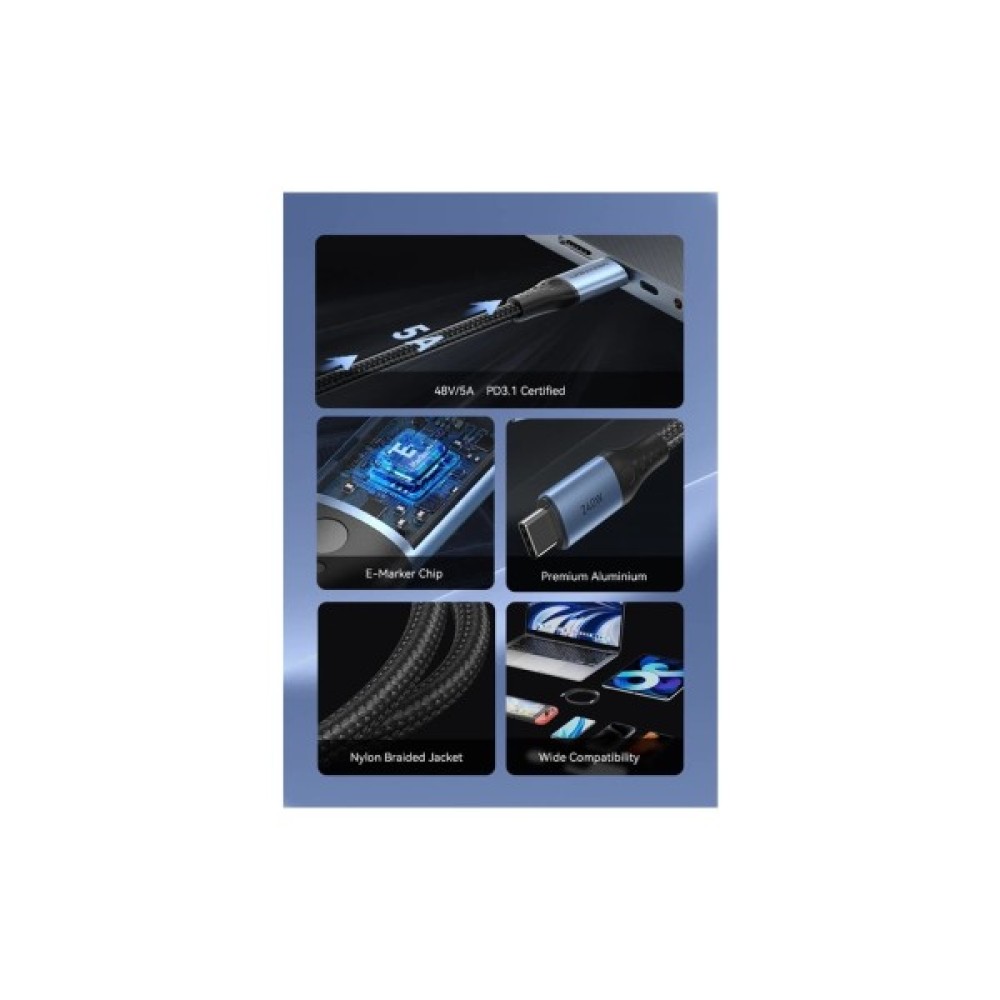 Підтримка Power Delivery 3.1 на 240 Вт: Цей кабель використовує вдосконалений протокол зарядки PD 3.1 для підтримки максимального струму 5 А та напруги 48 В, що забезпечує величезну вихідну потужність 240 Вт. Це робить його винятково здатним живити найвимогливіші ноутбуки на ринку, наприклад, заряджати MacBook Pro 16" до 68% приблизно за одну годину, залишаючись при цьому зворотно сумісним з пристроями меншої потужності, такими як планшети та смартфони, для швидкого поповнення заряду батареї.