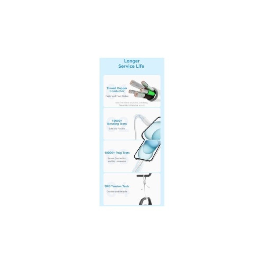 Корпус конекторів з алюмінієвого сплаву та тканинна оплітка кабелю підвищують його стійкість до зношування, вигинів та повсякденних пошкоджень. Така конструкція служить довше, ніж стандартні пластмасові кабелі.