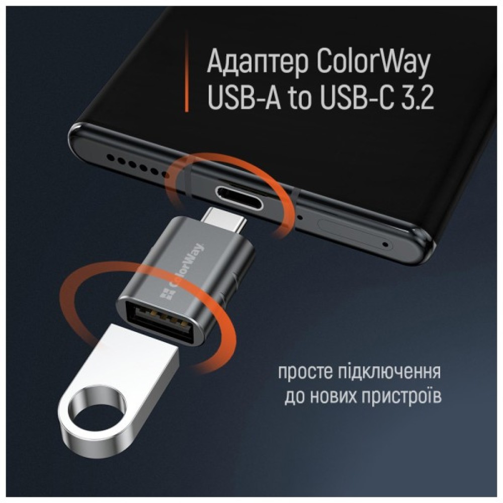 Адаптер-перехідник ColorWay USB-A to USB-C 3.2 дозволяє легко підключати USB-пристрої до сучасних девайсів із роз'ємом USB Type-C. Використовуйте його для підключення клавіатури, миші, флеш-накопичувачів, кардридерів, зовнішніх жорстких дисків та інших пристроїв до комп'ютера, ноутбука, смартфона чи планшета.