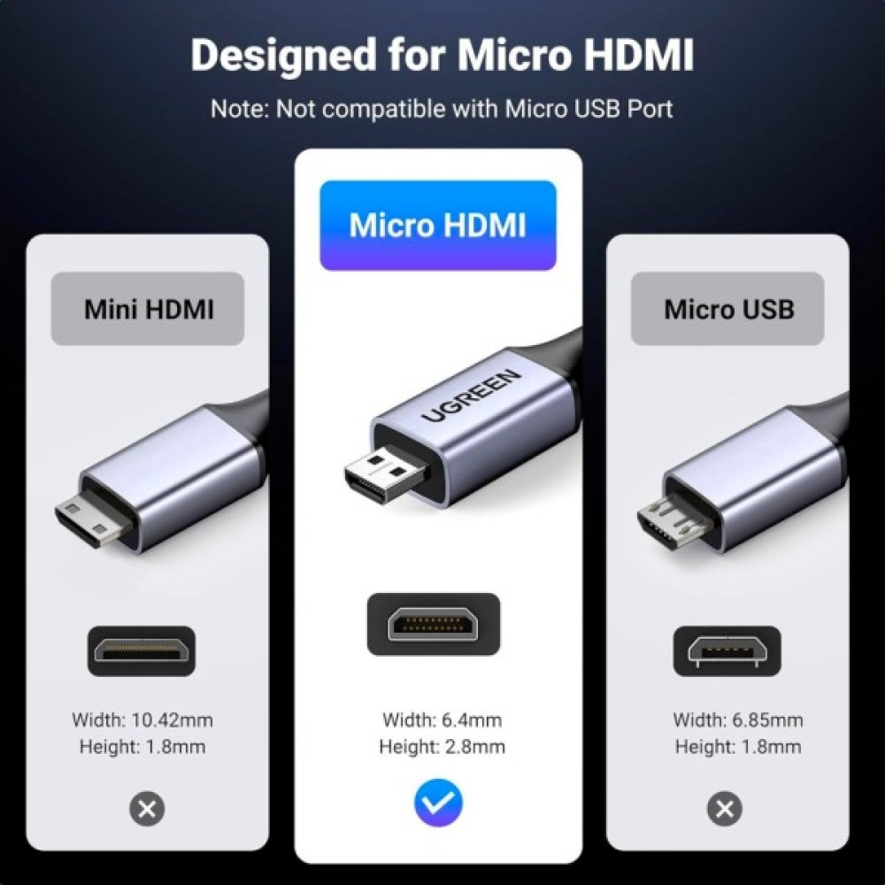 Кабель Ugreen Micro-HDMI підтримує роздільну здатність Full HD 8K-60 Гц, 4K-240 Гц і 4K-144 Гц. Він дозволяє транслювати аудіо та відео з камери, планшета чи ноутбука через порт Micro HDMI на ваш HDTV або проєктор з портом HDMI.