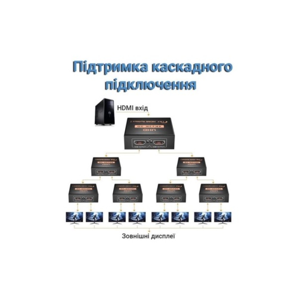 - Одночасне підключення 2-х моніторів HDMI до 1 відеосигналу відображаються одночасно.