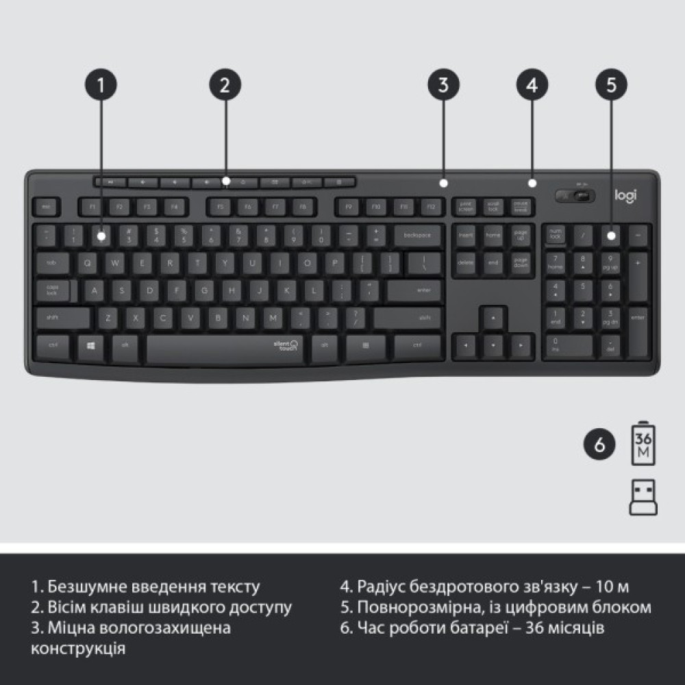 Інноваційна технологія SilentTouch гарантує зниження рівня шуму на понад 90% порівняно з моделлю Logitech MK270. Рівень гучності при введенні тексту та клацанні лівою кнопкою миші виміряний у незалежній лабораторії на відстані 1 м. Шум при роботі не дратує ні вас, ні оточуючих; при цьому зберігається тактильний відгук, до якого ви звикли при роботі з найпопулярнішими комплектами.