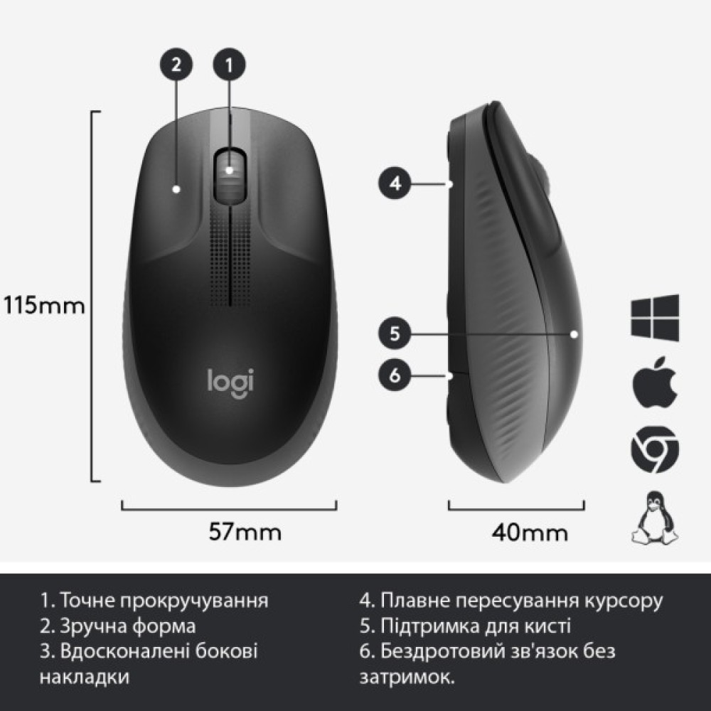Вибирайте темно-сірий відтінок, який підкреслює елегантність і сучасність вашого робочого простору, та насолоджуйтеся її простотою і витонченістю. Розміри Logitech M190 — 115.4 x 66.1 x 40.3 мм, що гарантує її компактність та зручність у використанні навіть у дорозі, якщо ви використовуєте її з ноутбуком.