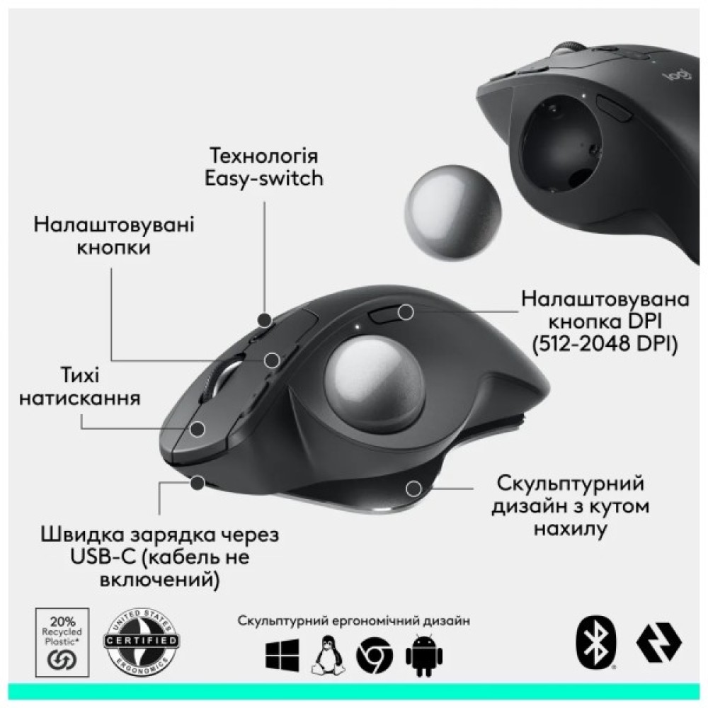 Естетична графітова кольорова палітра миші в комбінації з її чітко продуманими розмірами 132 х 100 х 51 мм та важить всього 164 г, робить її стильним та водночас практичним рішенням для вашого робочого простору. Обирайте Logitech MX Ergo S для бездоганного сполучення комфорту та високої продуктивності.
