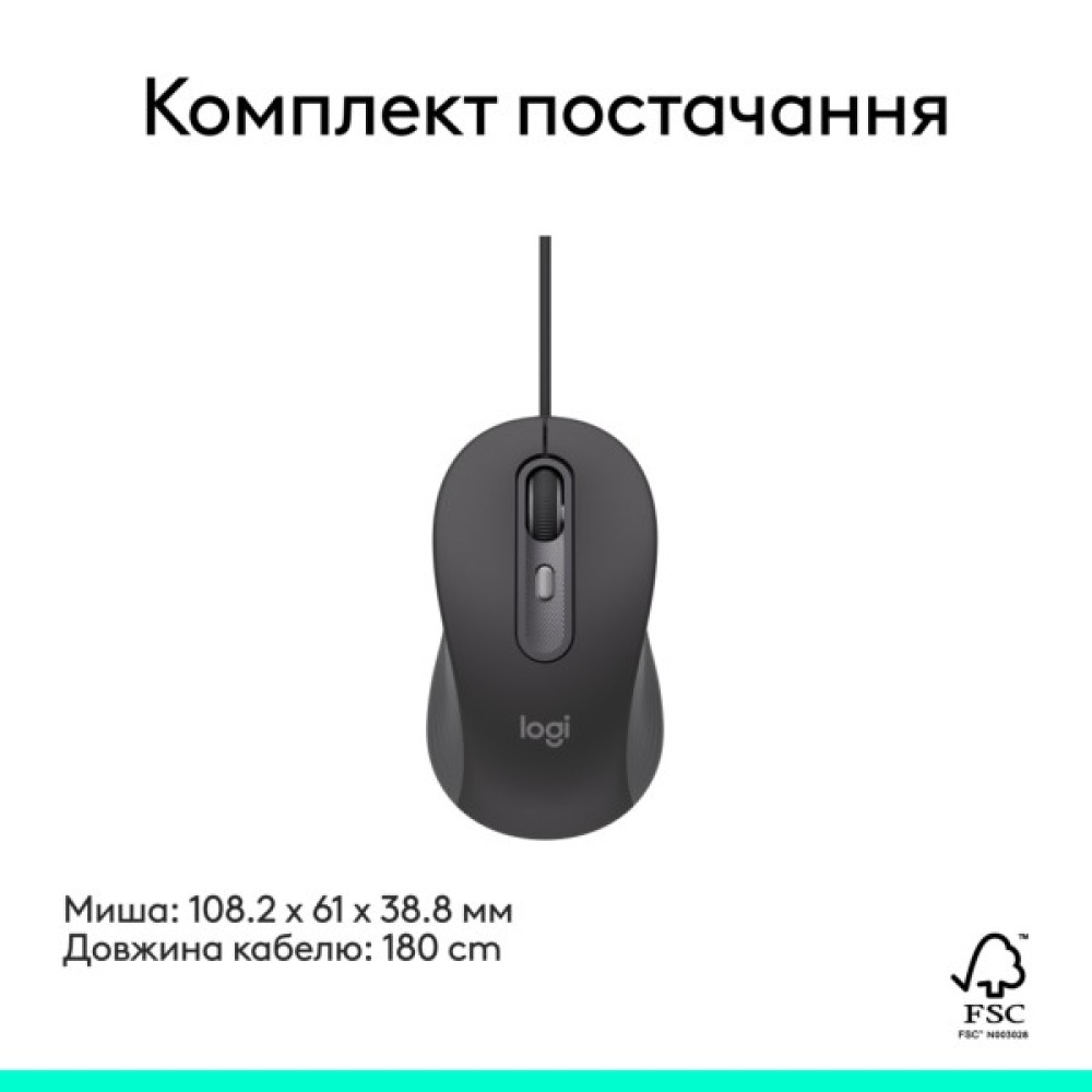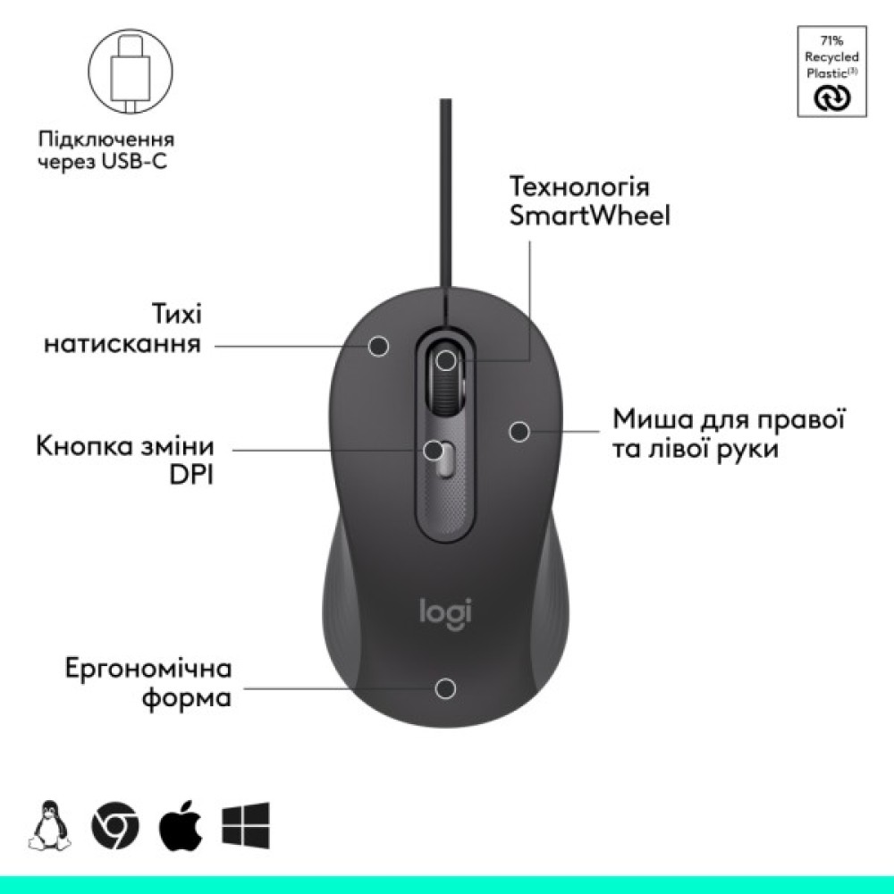 Ця модель виготовлена з екологічних матеріалів, в тому числі з переробленого пластику, що підкреслює відданість Logitech до збереження навколишнього середовища. Підсумовуючи, мишка Logitech Signature M520 for Business USB-C Graphite – це надійний, сучасний та екологічний інструмент, який об'єднує комфорт, технології і ефективність для вашої продуктивної роботи.