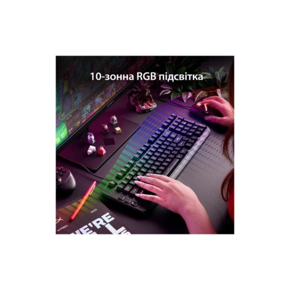 Клавіатура оснащена 10-зонним RGB-підсвічуванням, яке легко налаштовується через програмне забезпечення HyperX NGENUITY. Світлові ефекти з 16 777 216 кольорів створюють унікальну атмосферу ігрового простору, а п’ять рівнів яскравості дозволяють підібрати оптимальне освітлення для будь-яких умов.
