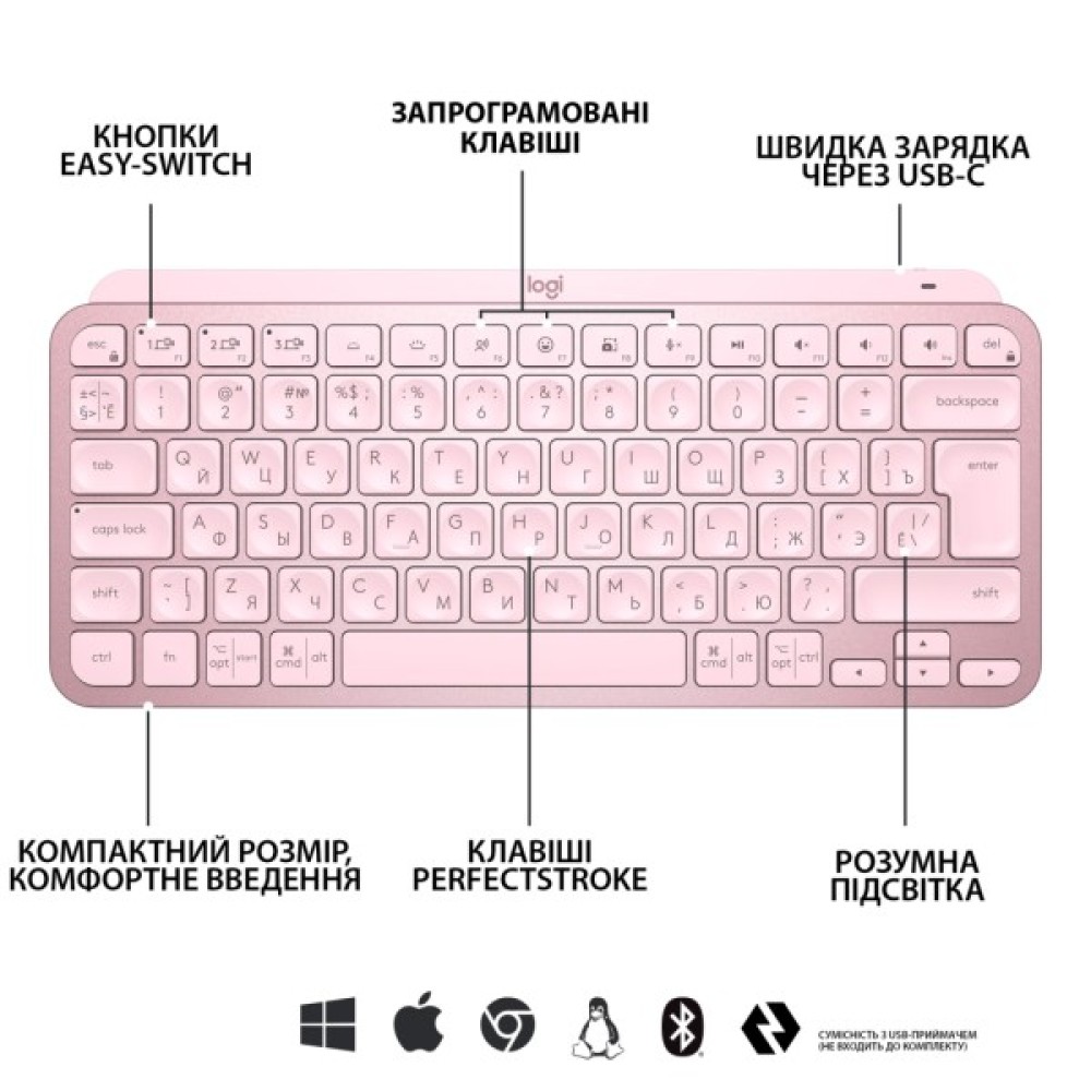 Клавіатура Logitech MX Keys Mini Wireless Illuminated UA Rose (920-010500) – це досконале поєднання функціональності та естетики, що стане незамінним інструментом для тих, хто цінує якість і зручність. Ця мультимедійна клавіатура з підсвіткою створена для оптимальної взаємодії з вашим телевізором чи іншим пристроєм, забезпечуючи повну свободу рухів завдяки бездротовому підключенню.
