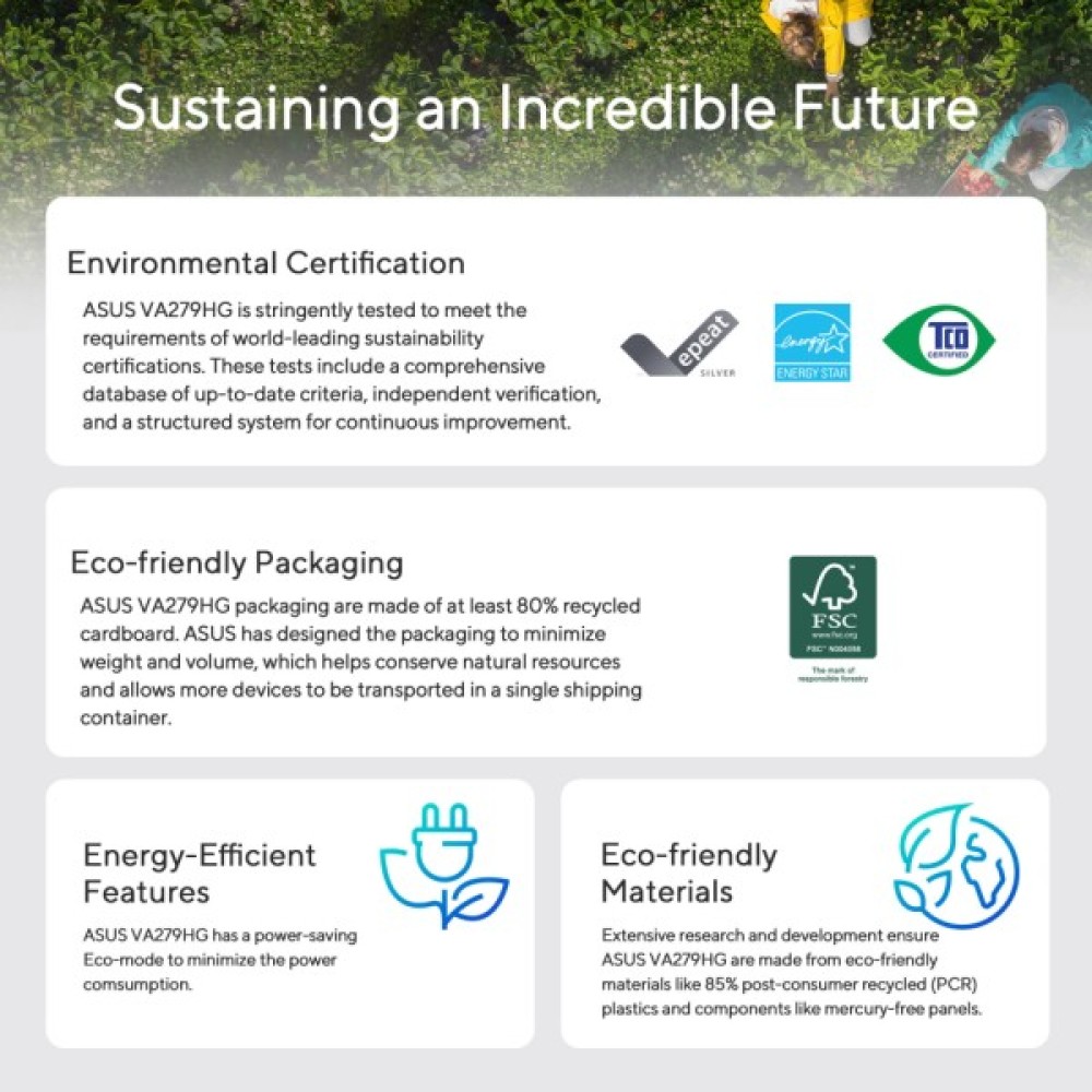 Монітор ASUS VA279HG дбає про здоров’я ваших очей за допомогою технологій TÜV Rheinland Flicker-Free та Low Blue Light, що зменшують мерехтіння та рівень синього світла. Ви зможете працювати довше без напруги на очі, зберігаючи їх комфорт у повному обсязі.