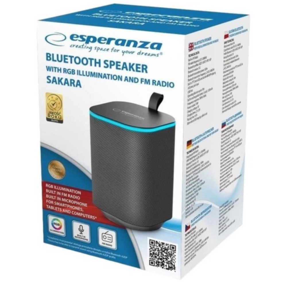 Акустична система Esperanza RGB Illuminated FM Sakara Black (EP155) - це чудовий вибір для тих, хто цінує якість звучання, стильний дизайн та багатофункціональність в одному пристрої. Цей легкий і портативний колонка створений, щоб задовольнити всі ваші музичні потреби під час подорожей, відпочинку на природі або просто вдома.