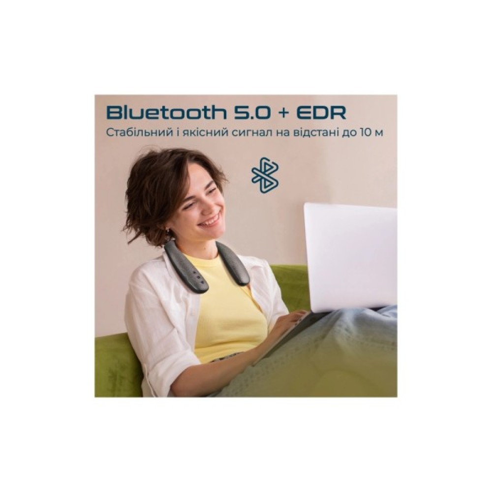 Не можна не відзначити ергономічний дизайн цієї моделі. Гнучке кріплення на шию забезпечує комфортне і безпечне використання, дозволяючи вашій увазі зосередитися на улюбленій музиці чи подкасті. Корпус покритий софт-тач пластиком та міцною плетеною тканиною, що додає естетичної привабливості і довговічності.